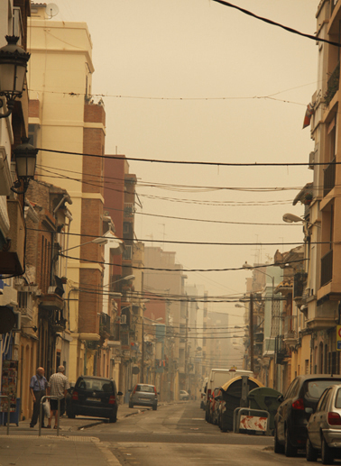 | Imagen de Valencia ayer por la mañana donde la atmósfera estaba llena de cenizas del incendio, vía María Santapau, según nos describe era una especie de niebla, falla y paella gigante. |